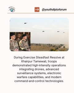 At Khairpur Tamewali, the Army Chief witnessed the high intensity field exercise Steadfast Resolve. The exercise showcased the integration of unmanned aerial systems, advanced surveillance tools, electronic warfare capabilities, and modern command and control systems.